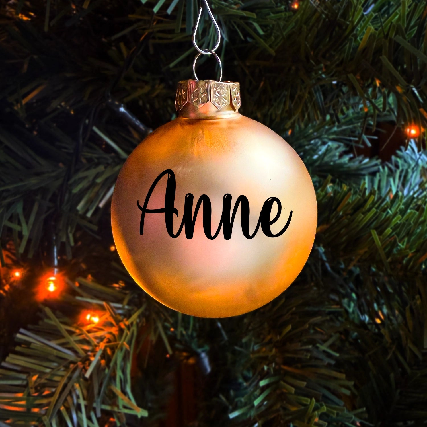 Onze naamstickers worden zorgvuldig uitgesneden uit hoogwaardig vinyl en zijn eenvoudig aan te brengen op gladde kerstballen.